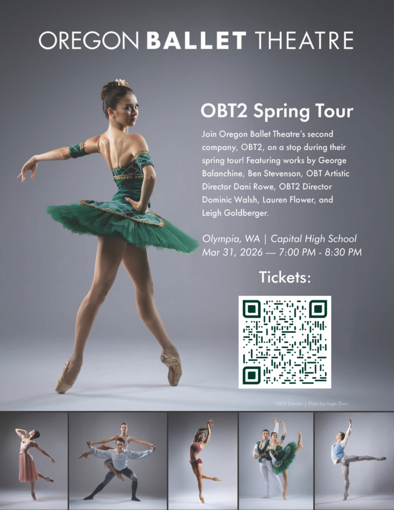 On March 31 at 7:00 PM, we have the rare opportunity to experience exactly that — right here in Olympia — as Oregon Ballet Theatre’s Second Company comes to town for a special tour performance at the Capital High School Performing Arts Center.