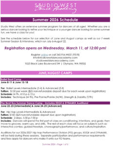 Please see the Summer 2026 Schedule for the full list of our camps and 7-week Summer Session! NEW this year…Intermediate and Advanced Hip Hop Mini-Intensives! Be sure to check it out!